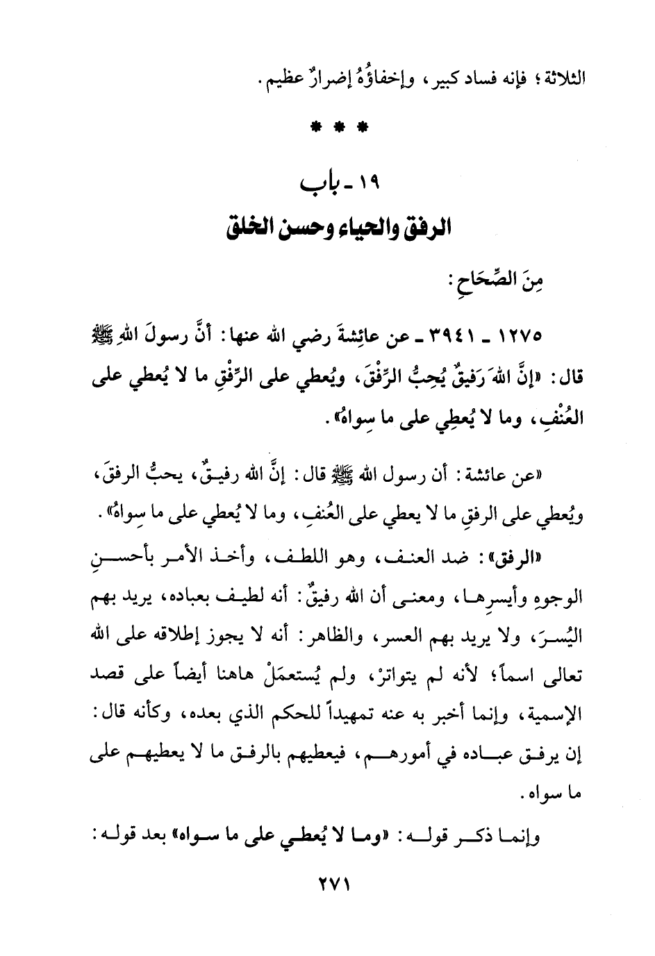 "عن عائشة: أن رسول الله صلى الله عليه وسلم قال: إن الله رفيق, يحب الرفق, ويعطي على الرفق ما لا يعطي على العنف, وما لا يعطي على ما سواه"