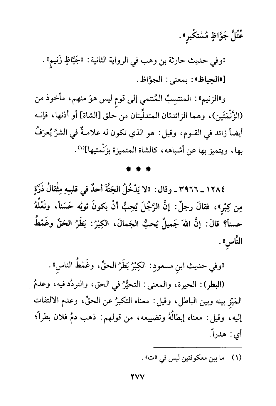 1284 - 3966 - وقال: "لا يدخل الجنة أحد في قلبه مثقال ذرة من كبر" فقال رجل: إن الرجل يحب أن يكون ثوبه حسنا, ونعله حسنا؟ قال: إن الله جميل يحب الجمال, الكبر: بطر الحق وغمط الناس"