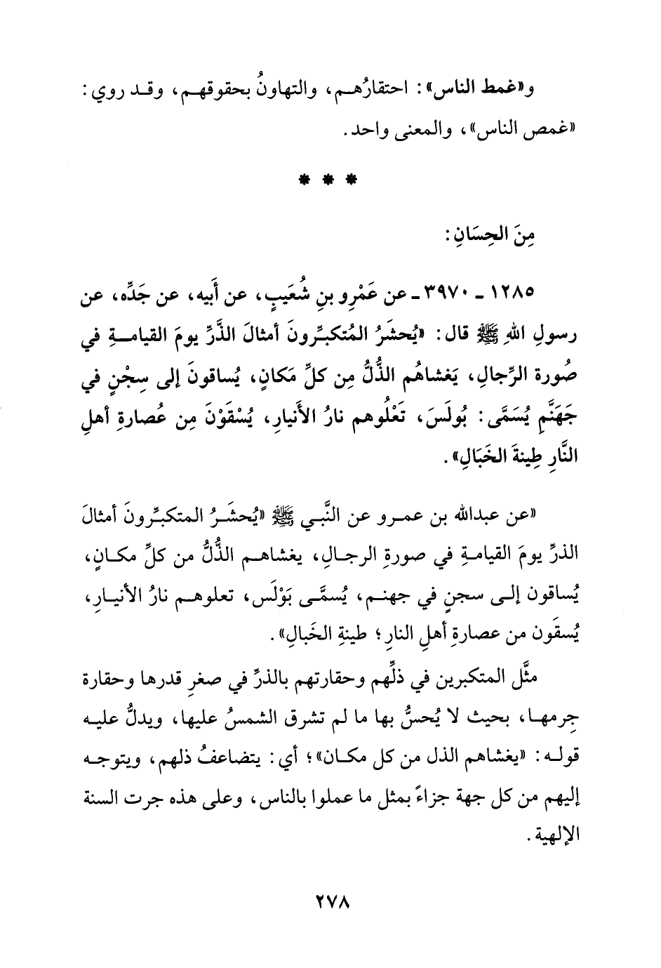 من الحسان:1285 - 3970 - عن عمرو بن شعيب عن أبيه عن جده عن رسول الله صلى الله عليه وسلم قال: "يحشر المتكبرون أمثال يوم القيامة في صورة الرجال, يغشاهم الذل من كل مكان, يساقون إلى سجن في جهنم يسمى: بولس, تعلوهم نار الأنيار, يسقون من عصارة أهل النار طينة الخبال"
