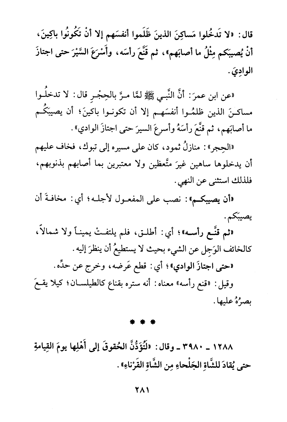 قال: "لا تدخلوا مساكن الذين ظلموا أنفسهم إلا أن تكونوا باكين, أن يصيبكم مثل ما أصابهم" ثم قنع رأسه, وأسرع السير حتى اجتاز الوادي.
