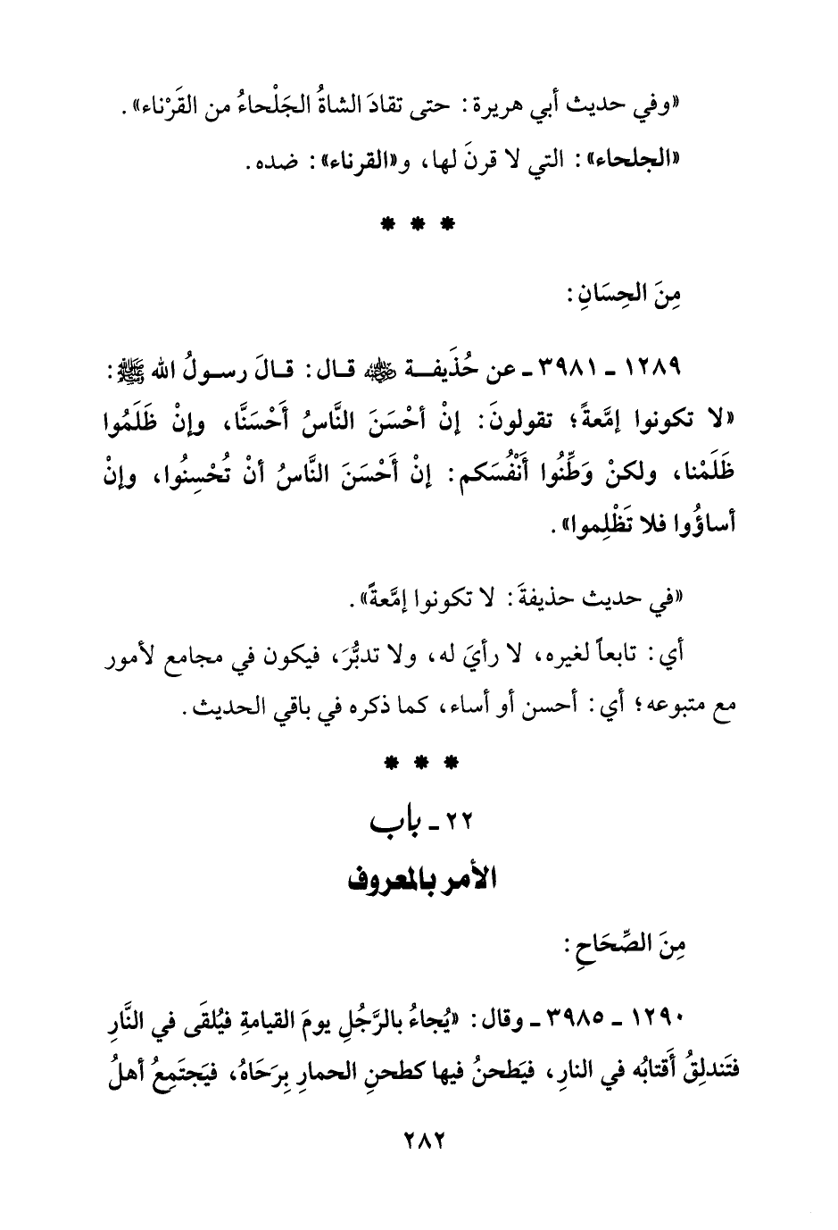 1289 - 3981 - عن حذيفة رضي الله عنه قال: قال رسول الله صلى الله عليه وسلم: "لا تكونوا إمعة, تقولون: إن أحسن الناس أحسنا, وإن ظلموا ظلمنا, ولكن وطنوا أنفسكم: إن أحسن الناس أن تحسنوا, وإن أساؤوا فلا تظلموا"