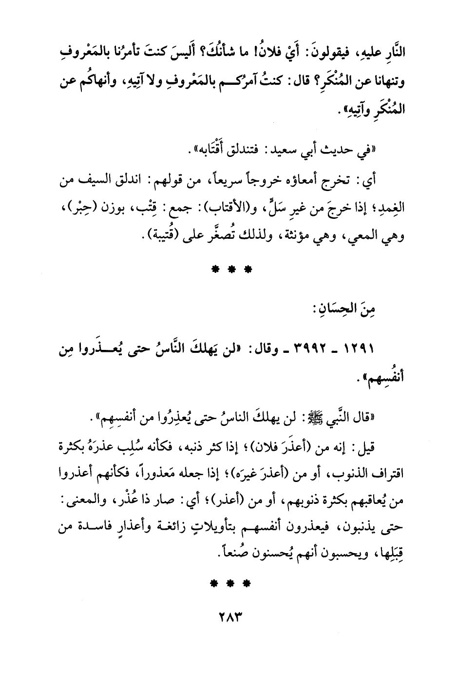 "قال النبي صلى الله عليه وسلم: لن يهلك الناس حتى يعذروا من أنفسهم"