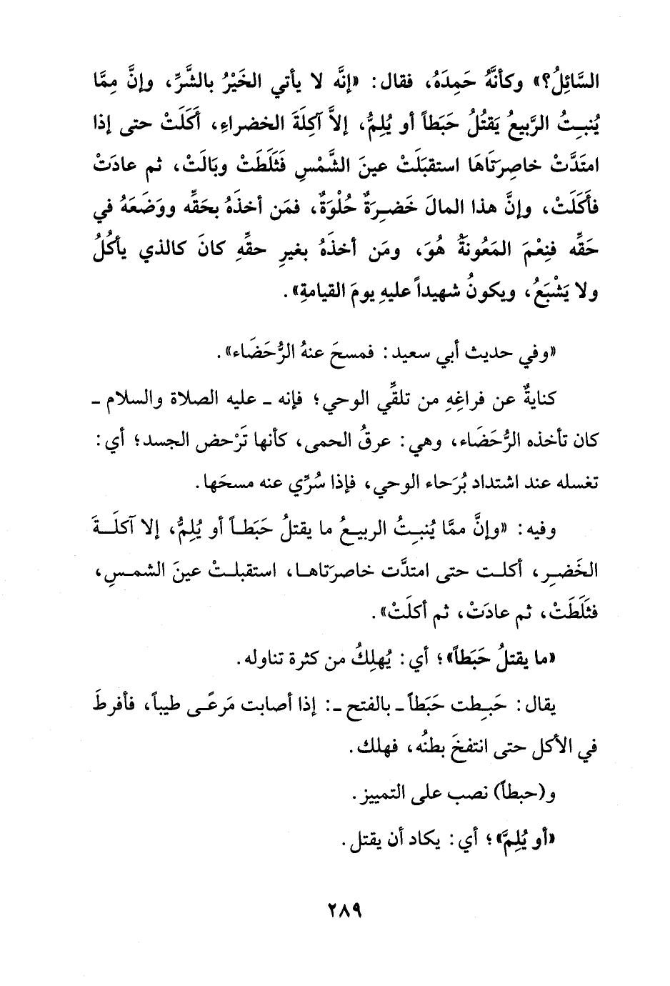 وفيه: "وإن مما ينبت الربيع ما يقتل حبطا أو يلم, إلا آكلة الخضر, أكلت حتى امتدت خاصرتها, استقبلت عين الشمس, فثلطت, ثم عادت, ثم أكلت"