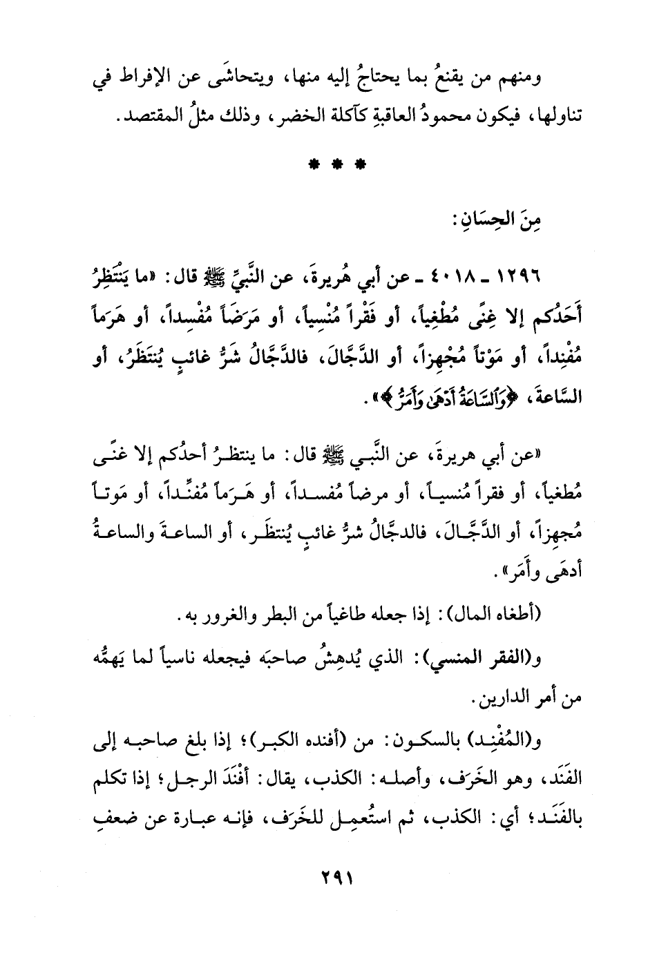 1296 - 4018 - عن أبي هريرة, عن النبي صلى الله عليه وسلم قال: "ما ينتظر أحدكم إلا غنى مطغيا, أو فقر منسيا, أو مرضا مفسدا, أو هرما مفندا, أو موتا مجهزا, أو الدجال, فالدجال شر غائب ينتظر, أو الساعة, {والساعة أدهى وأمر} ".