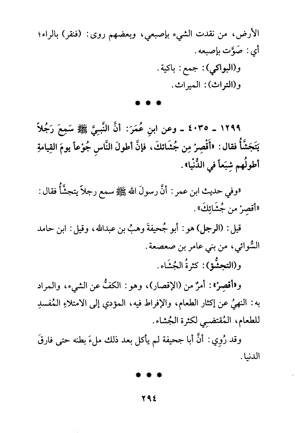1299 - 4035 - وعن ابن عمر: أن النبي صلى الله عليه وسلم سمع رجلا يتجشأ فقال: "أقصر من جشأتك, فإن أطول الناس جوعا يوم القيامة أطولهم شبعا في الدنيا"