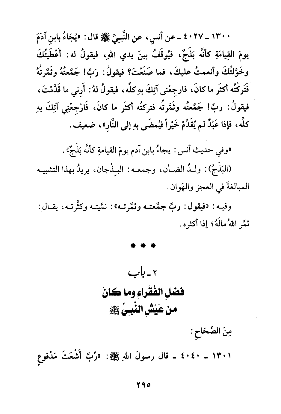 1300 - 4027 - عن أنس, عن النبي صلى الله عليه وسلم قال: "يجاء بابن آدم يوم القيامة كأنه بذج, فيوقف بين يدي الله, فيقول له: أعطيك وخولتك وأنعمت عليك, فما صنعت؟ فيقول: رب! جمعته وثمرته فتركته أكثر ما كان, فارجعني آتك به كله, فيقول له: أرني ما قدمت, فيقول: رب! جمعته وثمرته فتركته أكثر ما كان, فارجعني آتك به كله, فإذا لم يقدم خيرا فيمضى به إلى النار", ضعيف.