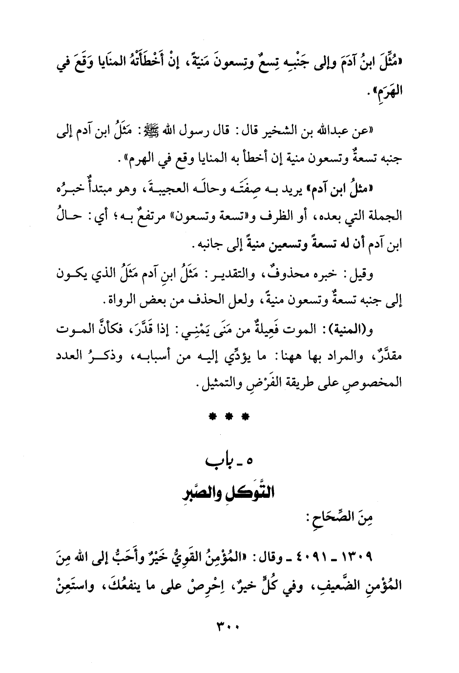 "عن عبد الله بن الشخير قال: قال رسول الله صلى الله عليه وسلم: مثل ابن آدم إلى جنبه تسعة وتسعون منية إن أخطأ به المنايا وقع في الهرم"