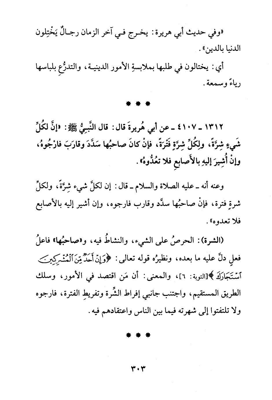 1312 - 4107 - عن أبي هريرة قال: قال النبي صلى الله عليه وسلم: "إن لكل شيء شرة, ولكل شرة فترة, فإن كان صاحبها سدد وقارب فارجوه, وإن أشير إليه بالأصابع فلا تعدوه"