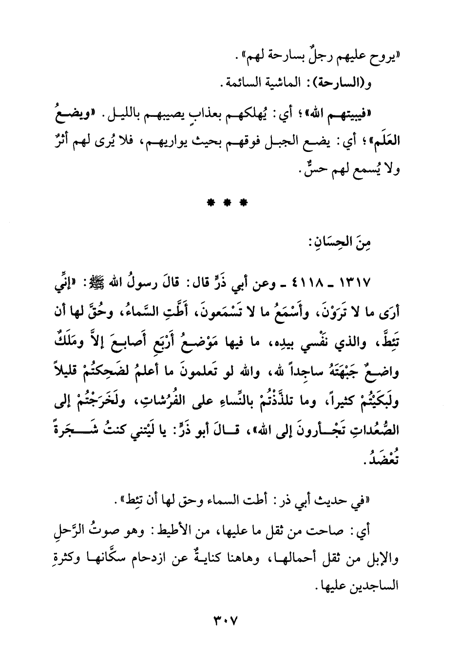 1317 - 4118 - وعن أبي ذر قال: قال رسول الله صلى الله عليه وسلم: "إني أرى ما ترون, وأسمع ما لا تسمعون, أطت السماء, وحق لها أن تئط, والذي نفسي بيده, ما فيها موضع أربع أصابع إلا وملك واضع جبهته ساجدا لله, والله لو تعلمون ما أعلم لضحكتم قليلا ولبكيتم كثيرا, وما تلذذتم بالنساء على الفرشات, ولخرجتم إلى الصعدات تجأرون إلى الله", قال أبو ذر: يا ليتني كنت شجرة تعضد"