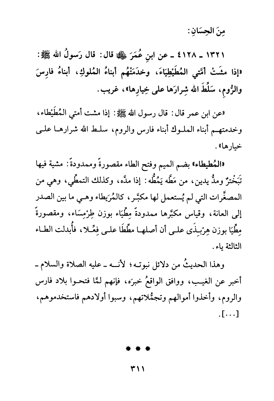 "عن ابن عمر قال: قال رسول الله صلى الله عليه وسلم: إذا مشت أمتي المطيطياء, وخدمتهم أبناء الملوك أبناء فارس والروم, سلط الله شرارها على خيارها"