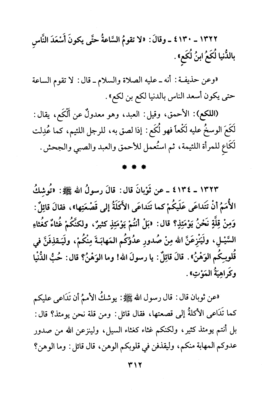 1323 - 4134 - عن ثوبان قال: قال رسول الله صلى الله عليه وسلم: "توشك الأمم تتداعى عليكم كما تتداعى الأكلة إلى قصعتها", فقال قائل: ومن قلة نحن يومئذ؟ قال: "بل أنتم يومئذ كثير, ولكنكم غثاء كغثاء السيل, ولينزعن الله من صدور عدوكم المهابة منكم, وليقذفن في قلوبكم الوهن", قال قائل: يا رسول الله! وما الوهن؟ قال: حب الدنيا وكراهية الموت"