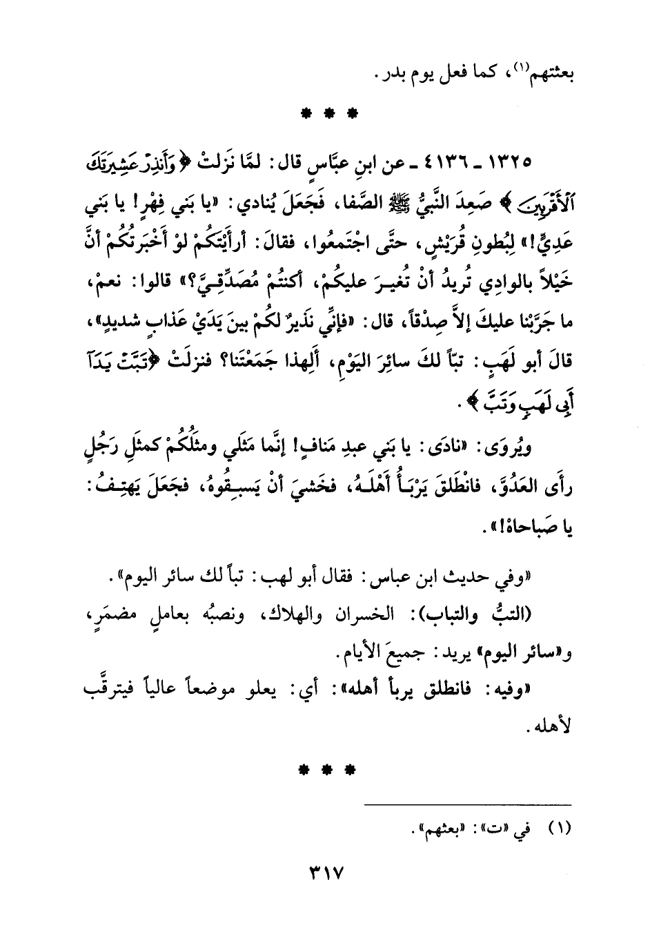 1325 - 4136 - عن ابن عباس قال: لما نزلت {وأنذر عشيرتك القربين} صعد النبي صلى الله عليه وسلم الصفا, فجعل ينادي: "يا بني فهر! يا بني عدي! لبطون قريش, حتى اجتمعوا, فقال: أرأيتكم لو أخبرتكم أن خيلا بالوادي تريد أن تغير عليكم, أكنتم مصدقي؟ قالوا: نعم, ما جربنا عليك إلا صدقا, قال: "فإني نذير لكم بين يدي عذاب شديد" قال أبو لهب: تبا لك سائر اليوم, ألهذا جمعتنا؟ فنزلت {تبت يدا أبي لهب وتب}.