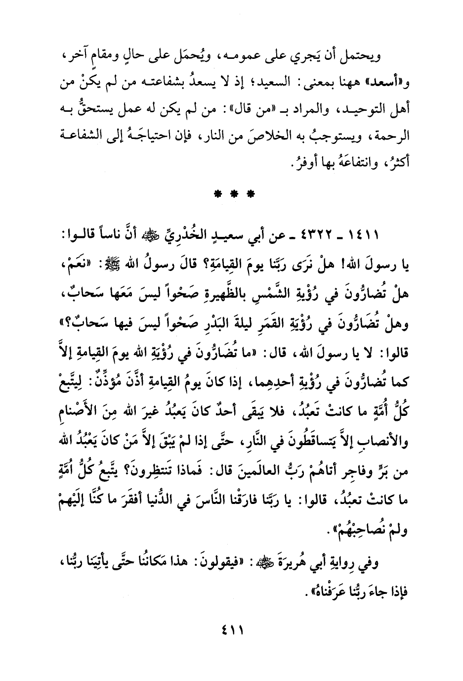 1411 - 4322 - عن أبي سعيد الخدري رضي الله عنه أن ناسا قالوا: يا رسول الله! هل نرى ربنا يوم القيامة؟ قال رسول الله صلى الله عليه وسلم: "نعم, هل تضارون في رؤية الشمس بالظهيرة صحوا ليس معها سحاب, وهل تضارون في رؤية القمر ليلة البدر صحوا ليس فيها سحاب؟ " قالوا: قالوا: لا يا رسول الله, قال: "ما تضارون في رؤية الله يوم القيامة إلا كما تضارون في رؤية أحدهما, إذا كان يوم القيامة أذن مؤذن: ليتبع كل أمة كا كانت تعبد, فلا يبقى أحد كان يعبد غير الله من الأصنام والأنصاب إلا يتساقطون في النار, حتى إذا لم يبق إلا من كان يعبد الله من بر وفاجر أتاهم رب العالمين قال: فماذا تنتظرون؟ يتبع كل أمة ما كانت تعبد, قالوا: يا ربنا فارقنا الناس في الدنيا أفقر ما كنا إليهم ولم نصاحبهم"