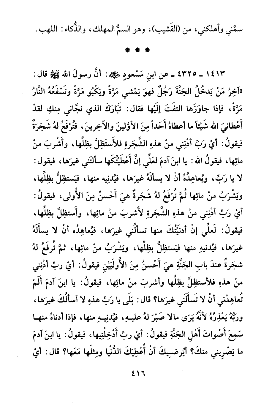 1413 - 4325 - عن ابن مسعود رضي الله عنه: أن رسول الله صلى الله عليه وسلم قال: "آخر من يدخل الجنة رجل فهو يمشي مرة ويكبو مرة وتسفعه النار مرة, فإذا جاوزها التفت إليها فقال: تبارك الذي نجاني منك لقد أعطاني الله شيئا ما أعطاه أحدا من الأولين والآخرين, فترفع له شجرة فيقول: أي رب أدنني من هذه الشجرة فلأستظل بظلها, وأشرب من مائها, فيقول الله: يا ابن آدم لعلي إن أعطيتكها سألني غيرها, فيقول: لا يا رب, ويعاهده أن لا يسأله غيرها, فيدنيه منها, فيستظل بظلها, ويشرب من مائها ثم ترفع له شجرة هي أحسن من الأولى, فيقول: أي رب أدنني من هذه الشجرة لأشرب من مائها, وأستظل بظلها, فيقول: لعلي إن أدنيتك منها تسألني غيرها, فيعاهده أن لا يسأله غيرها, فيدنيه منها فيستظل بظلها, ويشرب من مائها, ثم ترفع له شجرة عند باب الجنة هي أحسن من الأوليين فيقول: أي رب أدنني من هذه فلأستظل بظلها وأشرب من مائها, فيقول: يا ابن آدم ألم تعاهدني أن لا تسألني غيرها؟ قال: بل يا رب هذه لا أسألك غيرها, وربه يعذره لأنه يرى ما لا صبر له عليه, فيدنيه منها, فإذا أدناه منها سمع أصوات أهل الجنة فيقول: أي رب أدخلنيها, فيقول: يا ابن آدم ما يصريني منك؟ أيرضيك أن أعطيك الدنيا ومثلها معها؟ قال: أي