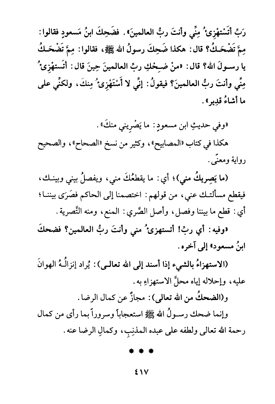 رب أتستهزئ مني وأنت رب العالمين". فضحك ابن مسعود فقالوا: مم تضحك؟ قال: هكذا ضحك رسول الله صلى الله عليه وسلم فقالوا: مم تضحك يا رسول الله؟ قال: "من ضحك رب العالمين حين قال: أتستهزئ مني وأنت رب العالمين؟ فيقول: إني لا أستهزئ منك, ولكني على ما أشاء قدير"