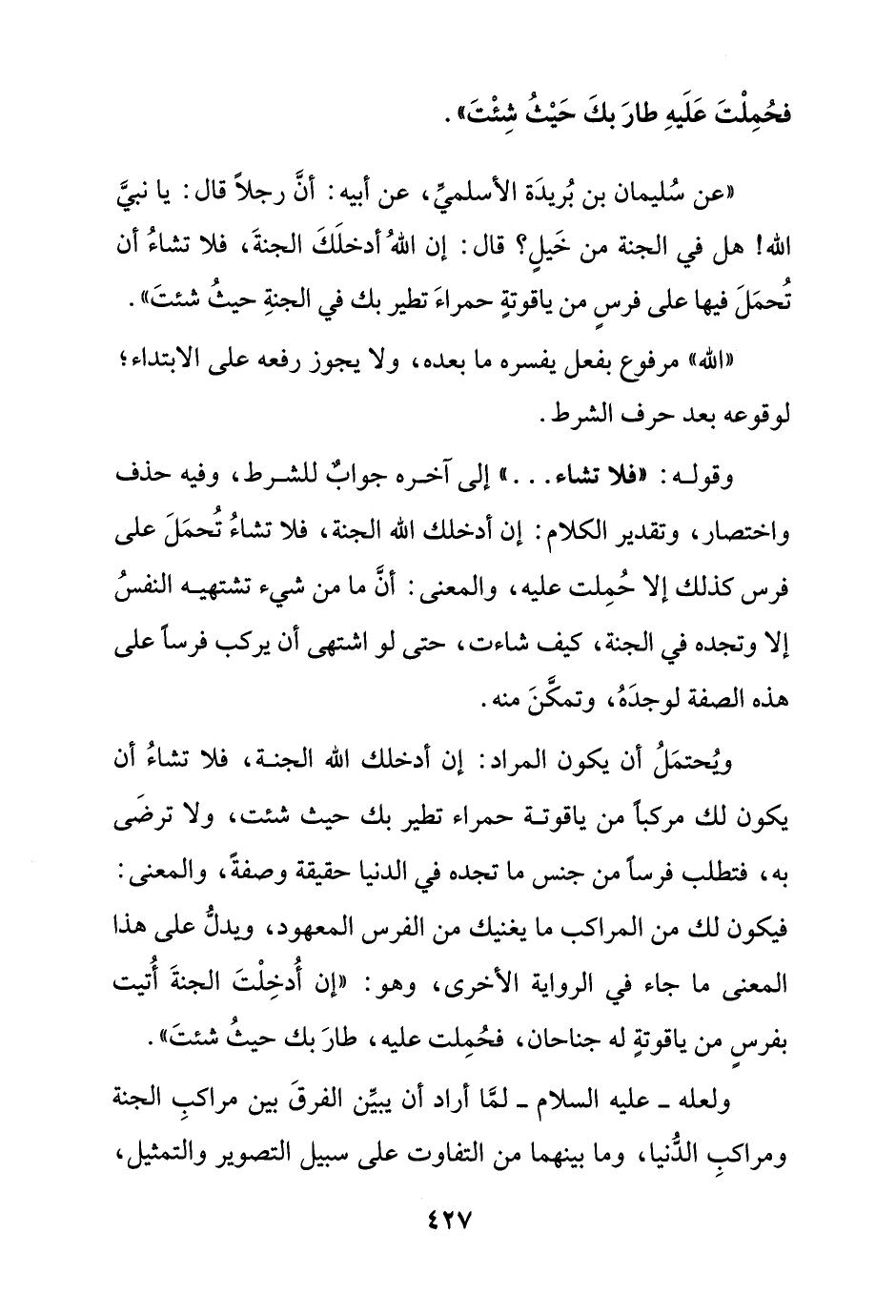 "عن سليمان بن بريدة الأسلمي, عن أبيه: أن رجلا قال: يا نبي الله! هل في الجنة من خيل؟ قال: إن الله أدخلك الجنة, فر تشاء أن تحمل فيها على فرس من ياقوتة حمراء تطير بك في الجنة حيث شئت"