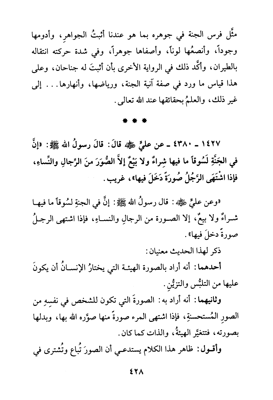 1427 – 4380 – عن علي رضي الله عنه قال: قال رسول الله صلى الله عليه وسلم: "إن في الجنة لسوقا ما فيها شراء ولا بيع إلا الصور من الرجال والنساء, فإذا اشتهى الرجل صورة دخل فيها", غريب.