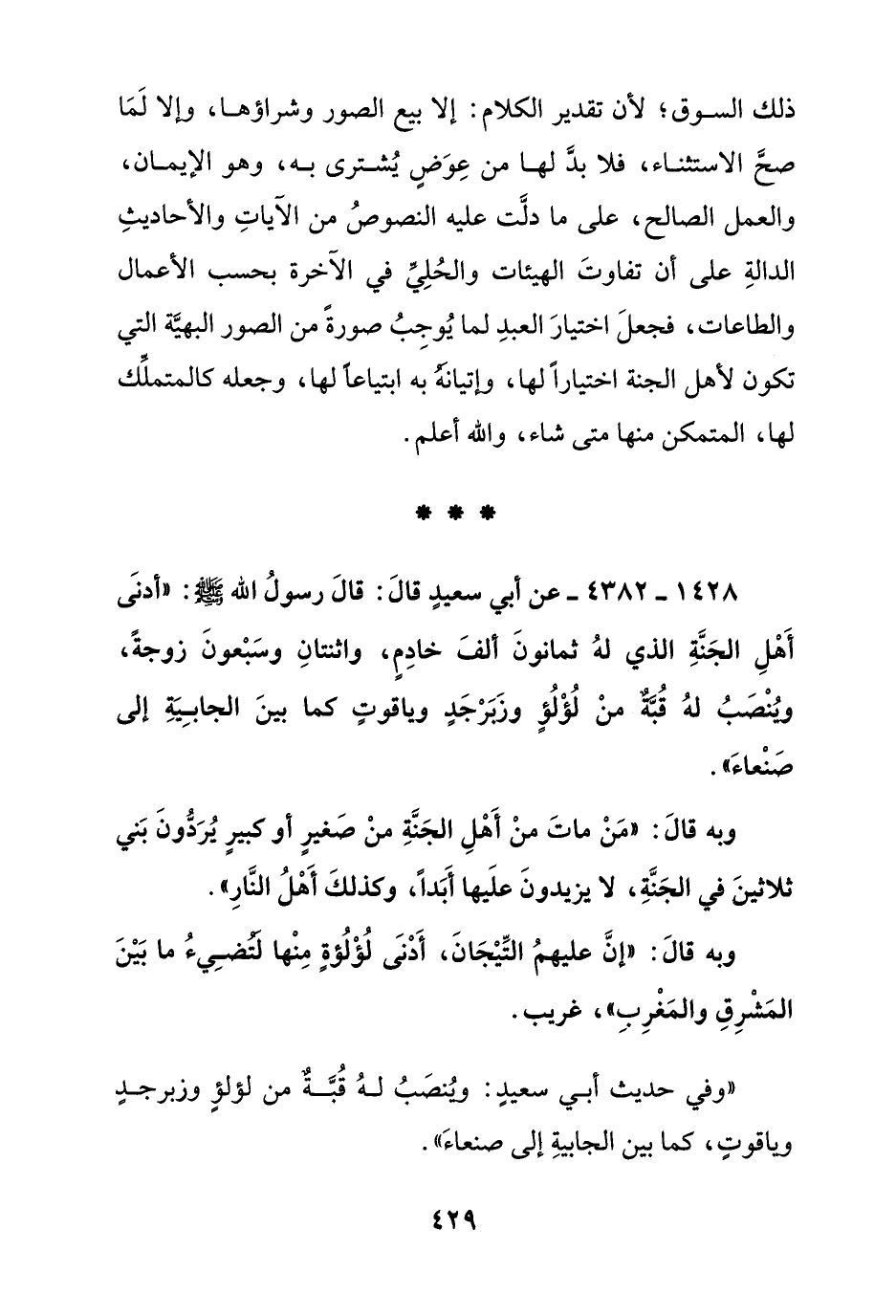 1428 – 4382 - عن أبي سعيد قال: قال رسول الله صلى الله عليه وسلم: "أدنى أهل الجنة الذي له ثمانون ألف خادم, واثنتان وسبعون زوجة, وينصب له قبة من لؤلؤ وزبرجد وياقوت كما بين الجابية إلى صنعاء"