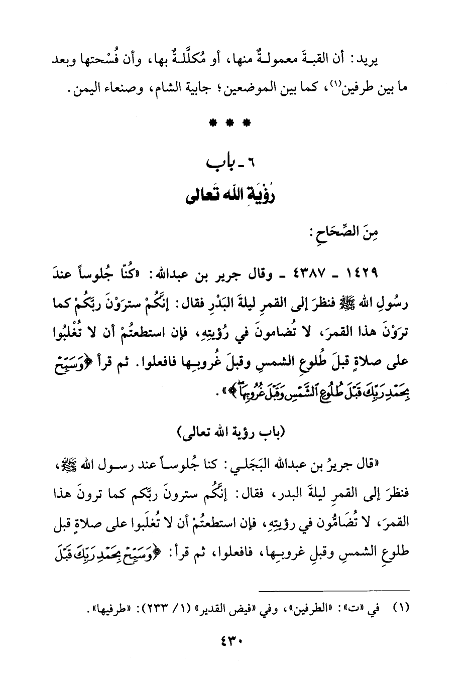 "قال جرير بن عبد الله البجلي: كنا جلوسا عند رسول الله صلى الله عليه وسلم, فنظر إلى القمر ليلة البدر, فقال: إنكم سترون ربكم كما ترون هذا القمر, لا تضامون في رؤيته, فإن استطعتم أن لا تغلبوا على صلاة قبل طلوع الشمس وقبل غروبها, فافعلوا, ثم قرأ {وسبح بحمد ربك قبل