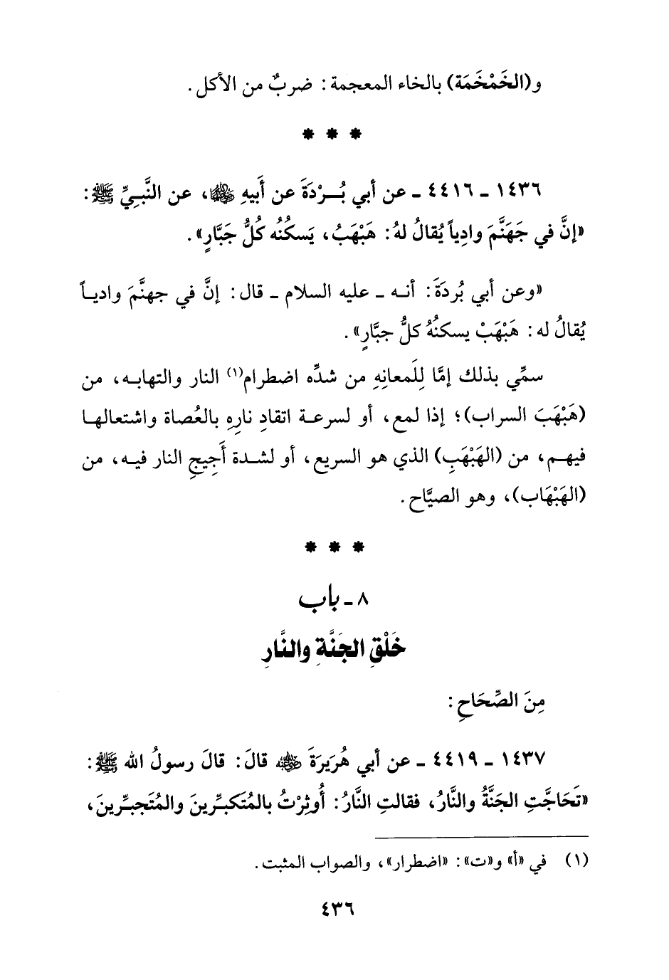 "وعن أبي بردة: أنه -عليه السلام- قال: إن في جهنم واديا يقال له: هبهب يسكنه كل جبار"
