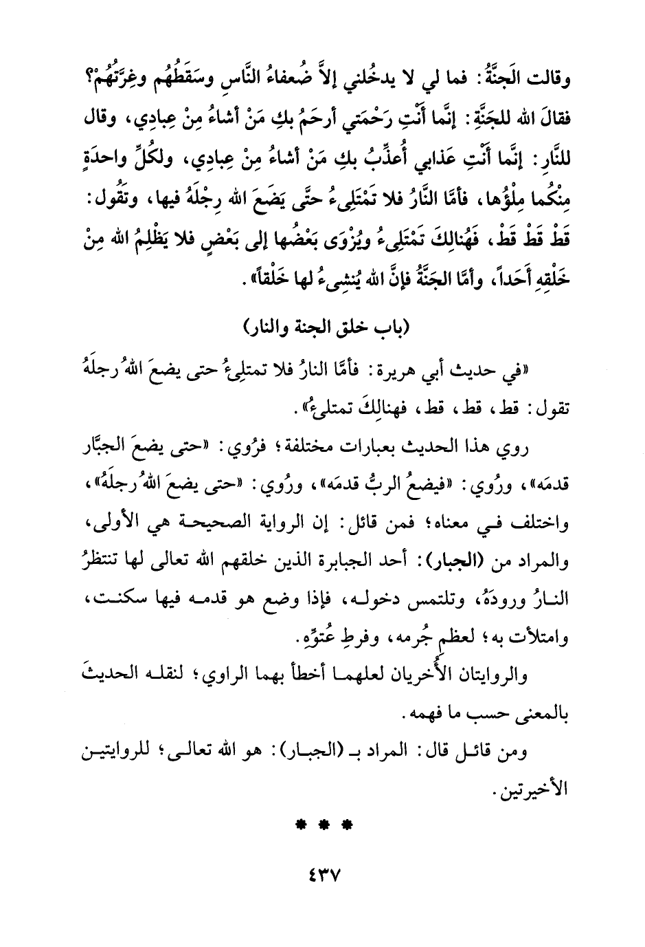 روي هذا الحديث بعبارات مختلفة, فروي: "حتى يضع الجبار قدمه" وروي: "فيضع الرب قدمه" وروي: "حتى يضع الله رجله", واختلف في معناه: فمن قائل: إن الرواية الصحيحة هي الأولى, والمراد من (الجبار): أحد الجبابرة الذين خلقهم الله تعالى لها تنتظر النار وروده, وتلتمس دخوله, فإذا وضع هو قدمه فيها سكنت, وامتلأت به, لعظم جرمه, وفرط عتوه.