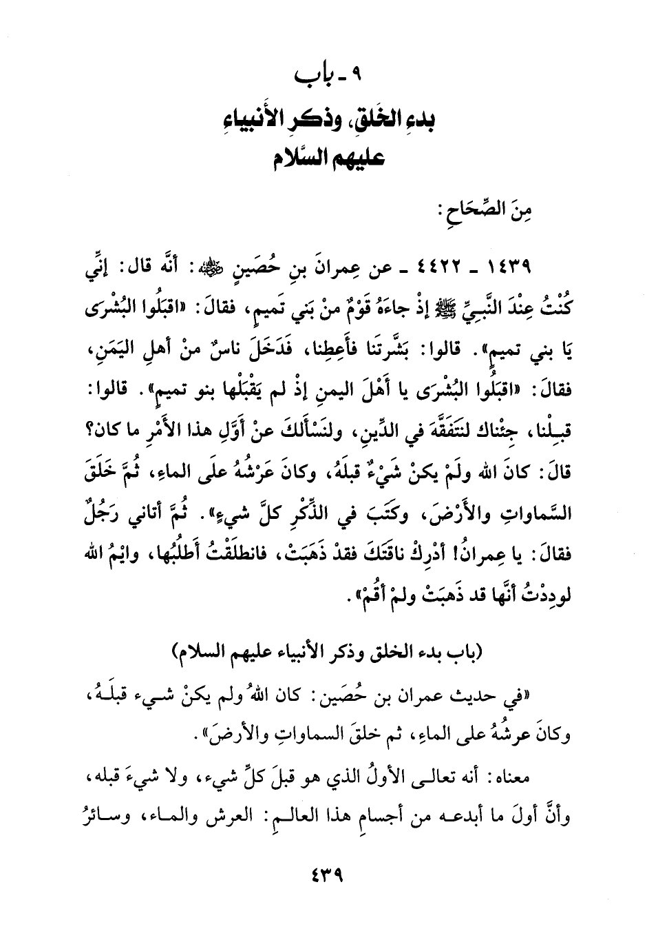 1439 - 4422 - عن عمران بن حصين رضي الله عنه: أنه قال: إني كنت عند النبي صلى الله عليه وسلم إذ جاءه قوم من بني تميم, فقال: "اقبلوا البشرى يا بني تميم". قالوا: بشرتنا فأعطنا, فدخل ناس من أهل اليمن, فقال: "اقبلوا البشرى يا أهل اليمن إذ لم يقبلها بنو تميم,. قالوا: قبلنا, جئناك لنتفقه في الدين, ولنسألك عن أول هذا الأمر ما كان؟ قال: كان الله ولم يكن شيء قبله, وكان عرشه على الماء, ثم خلق السماوات والأرض, وكتب في الذكر كل شيء". ثم أتاني رجل فقال: يا عمران! أدرك ناقتك فقد ذهبت, فانطلقت أطلبها, وايم الله لوددت أنها قد ذهبت ولم أقم".