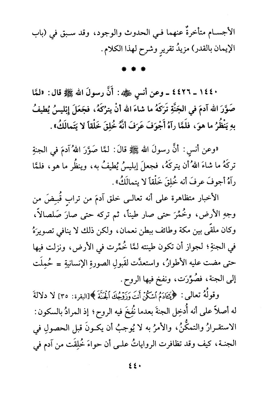 1440 – 4426 – وعن أنس رضي الله عنه: أن رسول الله صلى الله عليه وسلم قال: "لما صور الله آدم في الجنة تركه ما شاء الله أن يتركه, فجعل إبليس يطيف به ينظر ما هو, فلما رآه أجوف عرف أنه خلق خلقا لا يتمالك"