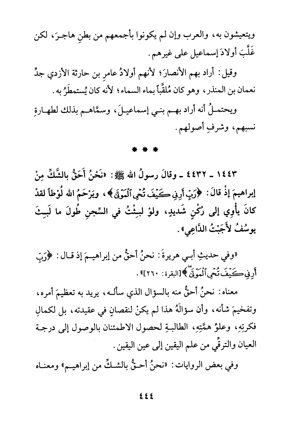 "وفي حديث أبي هريرة: نحن أحق من إبراهيم إذ قال: {رب أرني كيف تحي الموتى} [البقرة:260] ".
