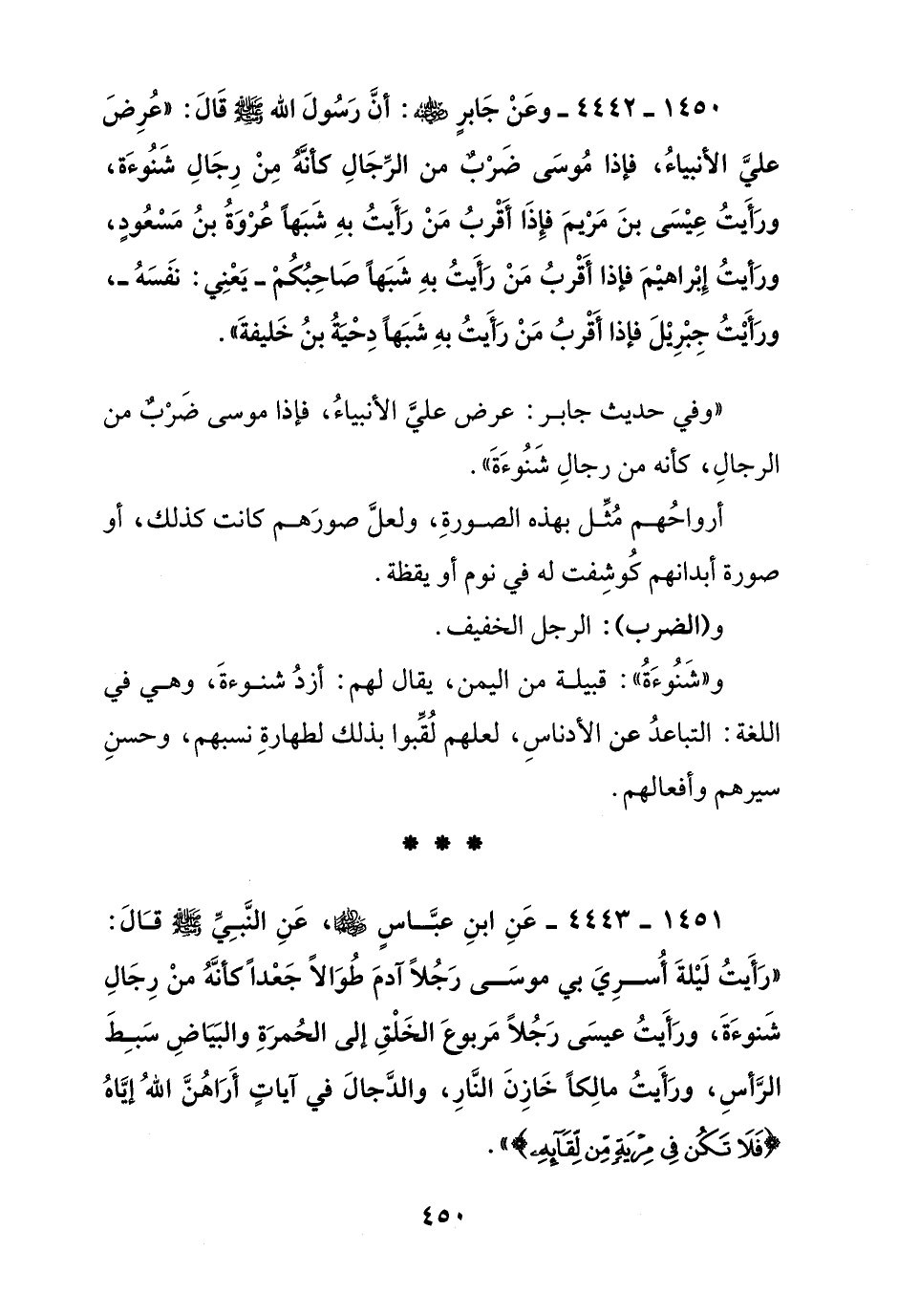 1451 – 4443 – عن ابن عباس رضي الله عنهما, عن النبي صلى الله عليه وسلم قال: "رأيت ليلة أسري بي موسى رجلا آدم طوالا جعدا كأنه من رجال شنوءة, ورأيت عيسى رجلا مربوع الخلق إلى الحمرة والبياض سبط الرأس, ورأيت مالكا خازن النار, والدجال في آيات أراهن الله إياه {فلا تكن في مرية من لقائه} ".