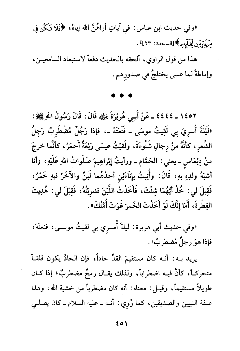1452 - 4444 – عن أبي هريرة رضي الله عنه قال: قال رسول الله صلى الله عليه وسلم: "ليلة أسري بي لقيت موسى –فنعته- فإذا رجل مضطرب رجل الشعر, كأنه من رجال شنوءة, ولقيت عيسى ربعة أحمر, كأنما خرج من ديماس –يعني: الحمام- ورأيت إبراهيم صلوات الله عليه, وأنا أشبه ولده به, قال: وأتيت بإناءين أحدهما لبن والآخر فيه خمر, فقيل لي: خذ أيهما شئت, فأخذت اللبن فشربته, فقيل لي: هديت الفطرة, أما إنك لو أخذت الخمر غوت أمتك".