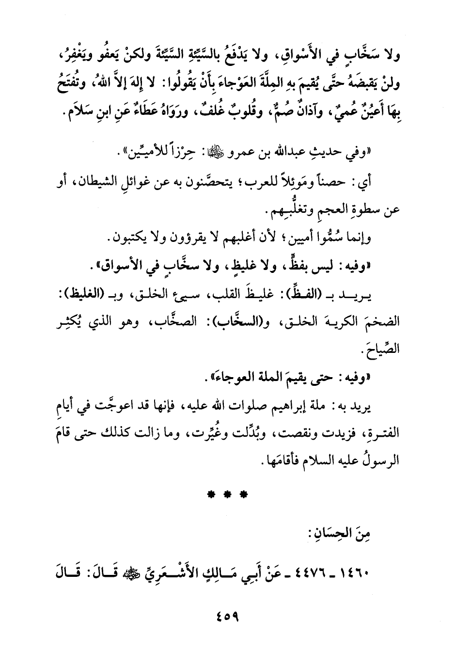 ولا سخاب في الأسواق, ولا يدفع بالسيئة السيئة ولكن يعفو ويغفر, ولن يقبضه حتى يقيم به الملة العوجاء بأن يقولوا: لا إله إلا الله, وتفتح بها أعين عمي, وآذان صم, وقلوب غلف, ورواه عطاء بن ابن سلام.