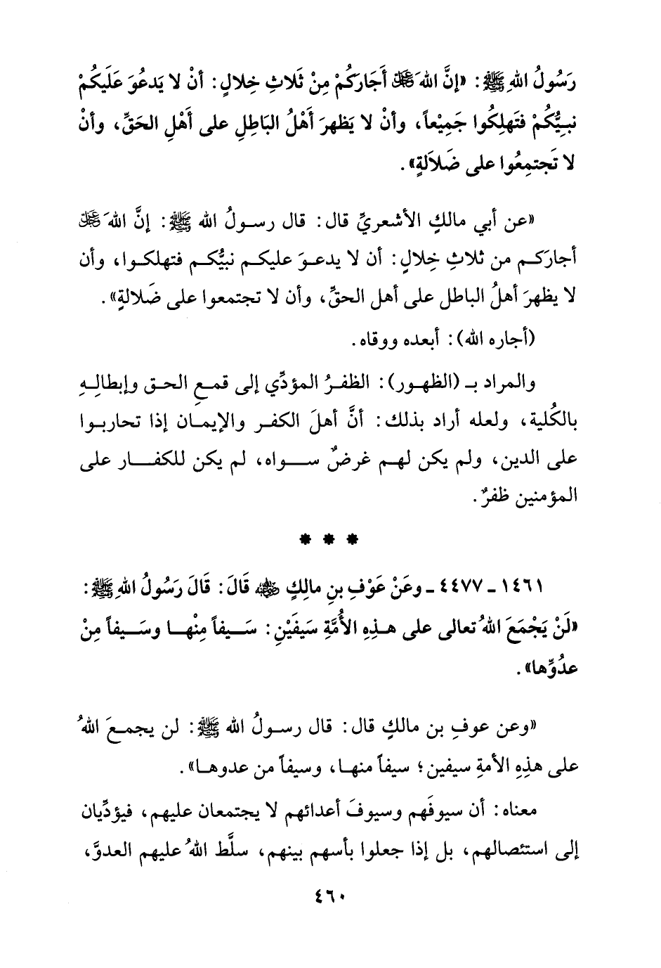 1461 - 4477 - وعن عوف بن مالك رضي الله عنه قال: قال رسول الله صلى الله عليه وسلم: "لن يجمع الله على هذه الأمة سيفين, سيفا منها, وسيفا من عدوها"