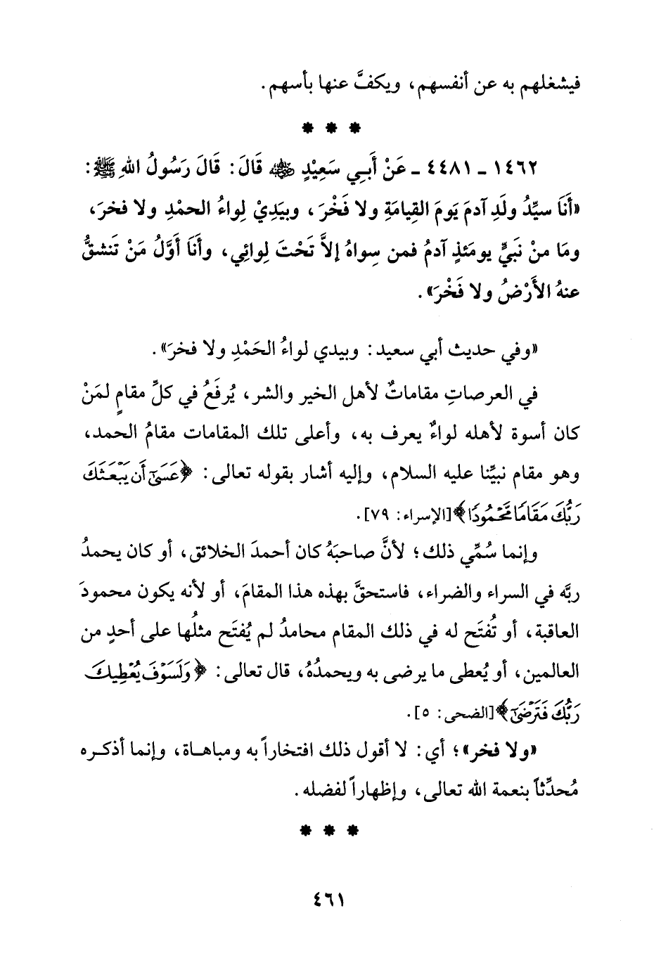 1462 - 4481 - عن أبي سعيد رضي الله عنه قال: قال رسول الله صلى الله عليه وسلم: "أنا سيد ولد آدم يوم القيامة ولا فخر, وبيدي لواء الحمد ولا فخر, وما من نبي يومئذ آدم فمن سواه إلا تحت لوائي, وأنا أول من تنشق عنه الأرض ولا فخر"
