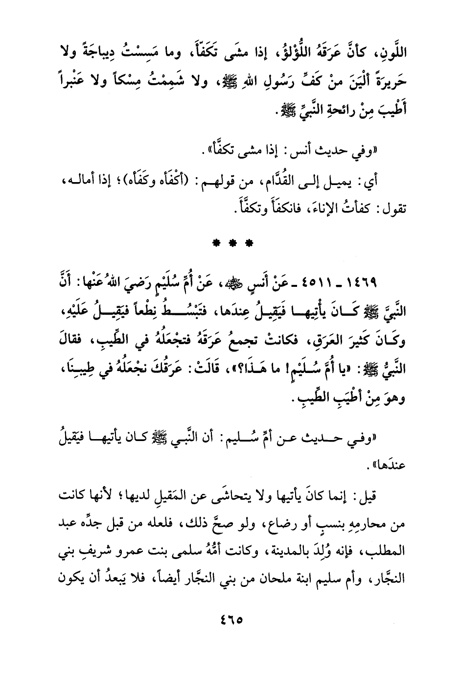 1469 - 4511 - عن أنس رضي الله عنه عن أم سليم رضي الله عنها: أن النبي صلى الله عليه وسلم كان يأتيها فيقبل عندها, فتبسط نطعا فيقيل عليه, وكان كثير العرق, فكانت تجمع عرقه فتجعله في الطيب, فقال النبي صلى الله عليه وسلم: "يا أم سليم! ما هذا؟ "قالت: عرقك نجعله في طيبنا, وهو من أطيب الطيب"