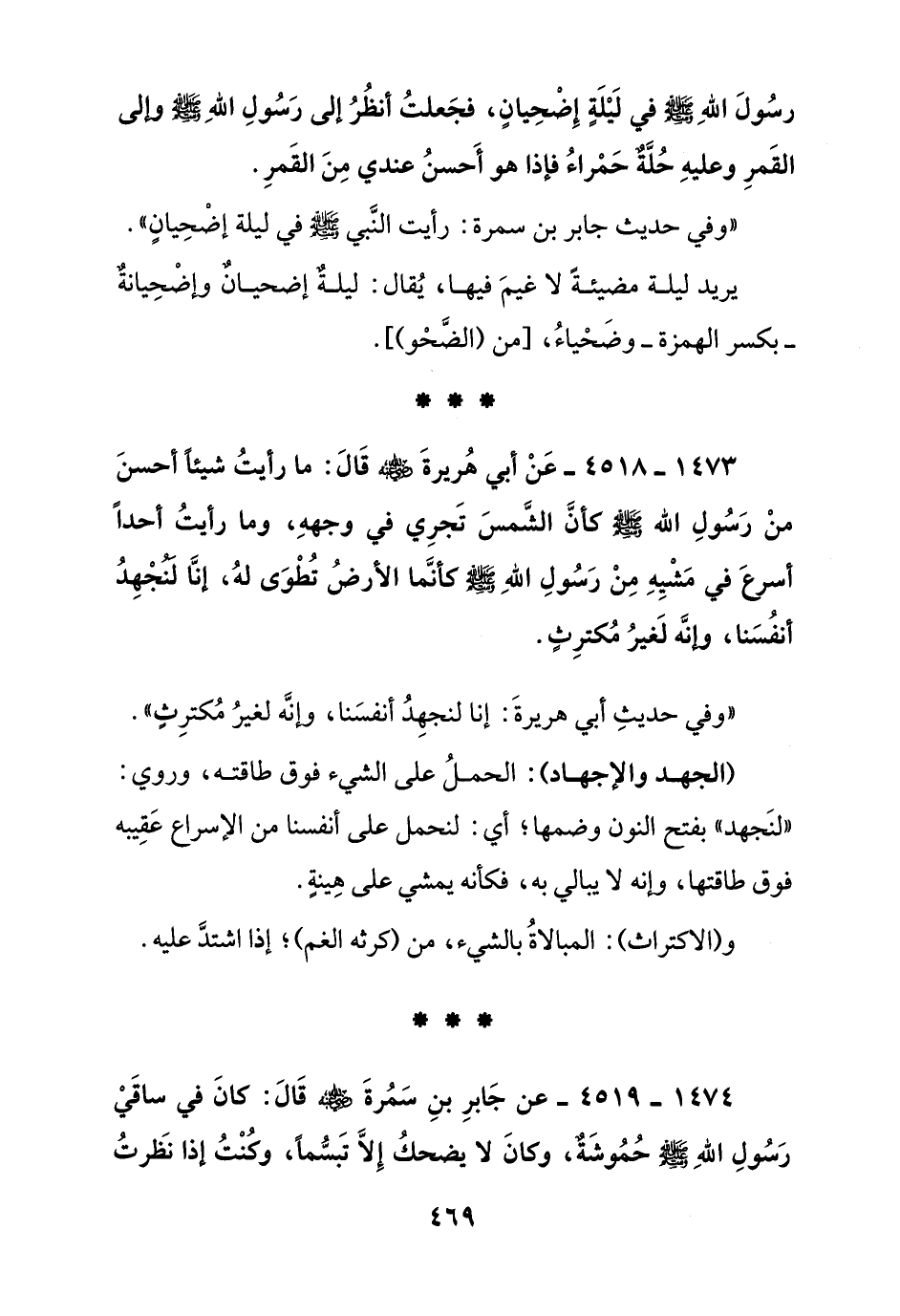 1473 - 4518 - عن أبي هريرة رضي الله عنه قال: ما رأيت شيئا أحسن من رسول الله صلى الله عليه وسلم كأن الشمس تجري في وجهه, وما رأيت أحدا أسرع في مشيه من رسول الله صلى الله عليه وسلم كأنما الأرض تطوى له, إنا لنجهد أنفسنا, وإنه لغير مكترث.