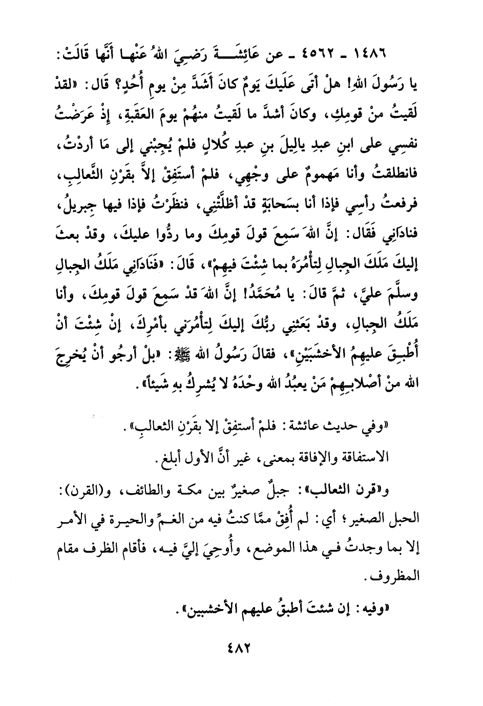 1486 – 4562 - عن عائشة رضي الله عنها أنها قالت: يا رسول الله! هل أتى عليك يوم كان أشد من يوم أحد؟ قال: "لقد لقيت من قومك, وكان أشد ما لقيت منهم يوم العقبة, إذ عرضت نفسي على ابن عبد ياليل بن عبد كلال فلم يجبني إلى ما أردت, فانطلقت وأنا مهموم على وجهي, فلم أستفق إلا بقرن الثعالب, فرفعت رأسي فإذا أنا بسحابة قد أظلتني, فنظرت فإذا فيها جبريل, فناداني فقال: إن الله سمع قول قومك وما ردوا عليك, وقد بعث إليك ملك الجبال لتأمره بما شئت فيهم", قال: "فناداني ملك الجبال وسلم علي, ثم قال: يامحمد! إن الله قد سمع قول قومك, وأنا ملك الجبال, وقد بعثني ربك إليك لتأمرني بأمرك, إن شئت أن أطبق عليهم الأخشبين" فقال رسول الله صلى الله عليه وسلم: "بل أرجو أن يخرج الله من أصلابهم من يعبد الله وحده لا يشرك به شيئا"