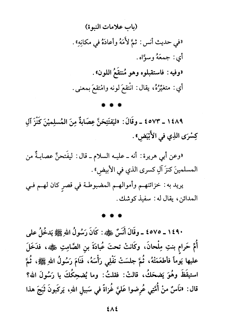 1490 - 4575 - وقال أنس رضي الله عنه: كان رسول الله صلى الله عليه وسلم يدخل على أم حرام بنت ملحان, وكانت تحت عبادة بن الصامت رضي الله عنه, فدخل عليها يوما فأطعته, ثم جلست تفلي رأسه, فنام رسول الله صلى الله عليه وسلم, ثم استيقظ وهو يضحك, قالت: فقلت: وما يضحكك يا رسول الله؟ قال: "ناس من أمتي عرضوا على غزاة في سبيل الله, يركبون ثبج هذا
