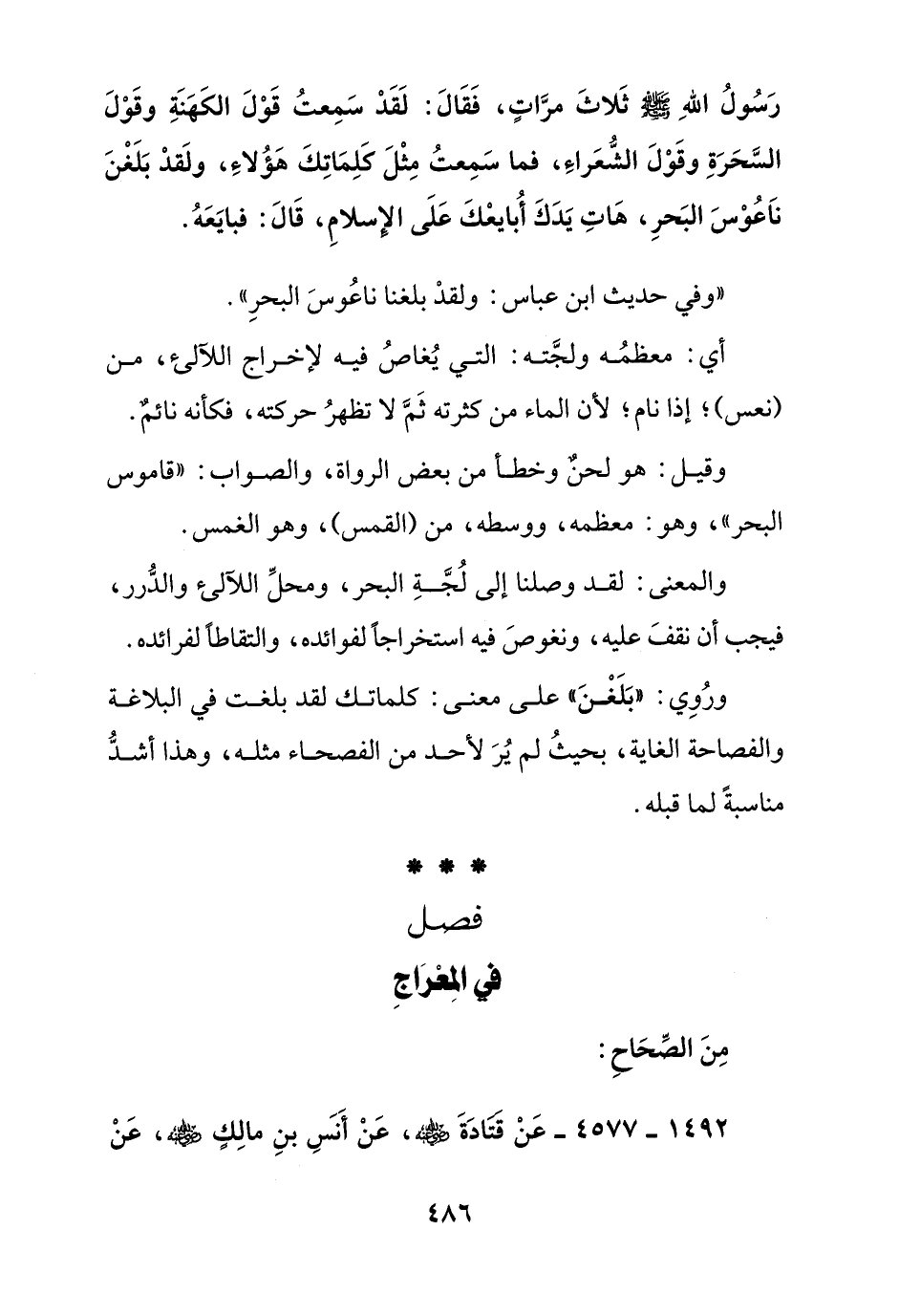 رسول الله صلى الله عليه وسلم ثلاث مرات, فقال: لقد سمعت قول الكهنة, وقول السحرة وقول الشعراء, فما سمعت مثل كلماتك هؤلاء, ولقد بلغن ناعوس البحر, هات يدك أبايعك على الإسلام, قال: فبايعه.