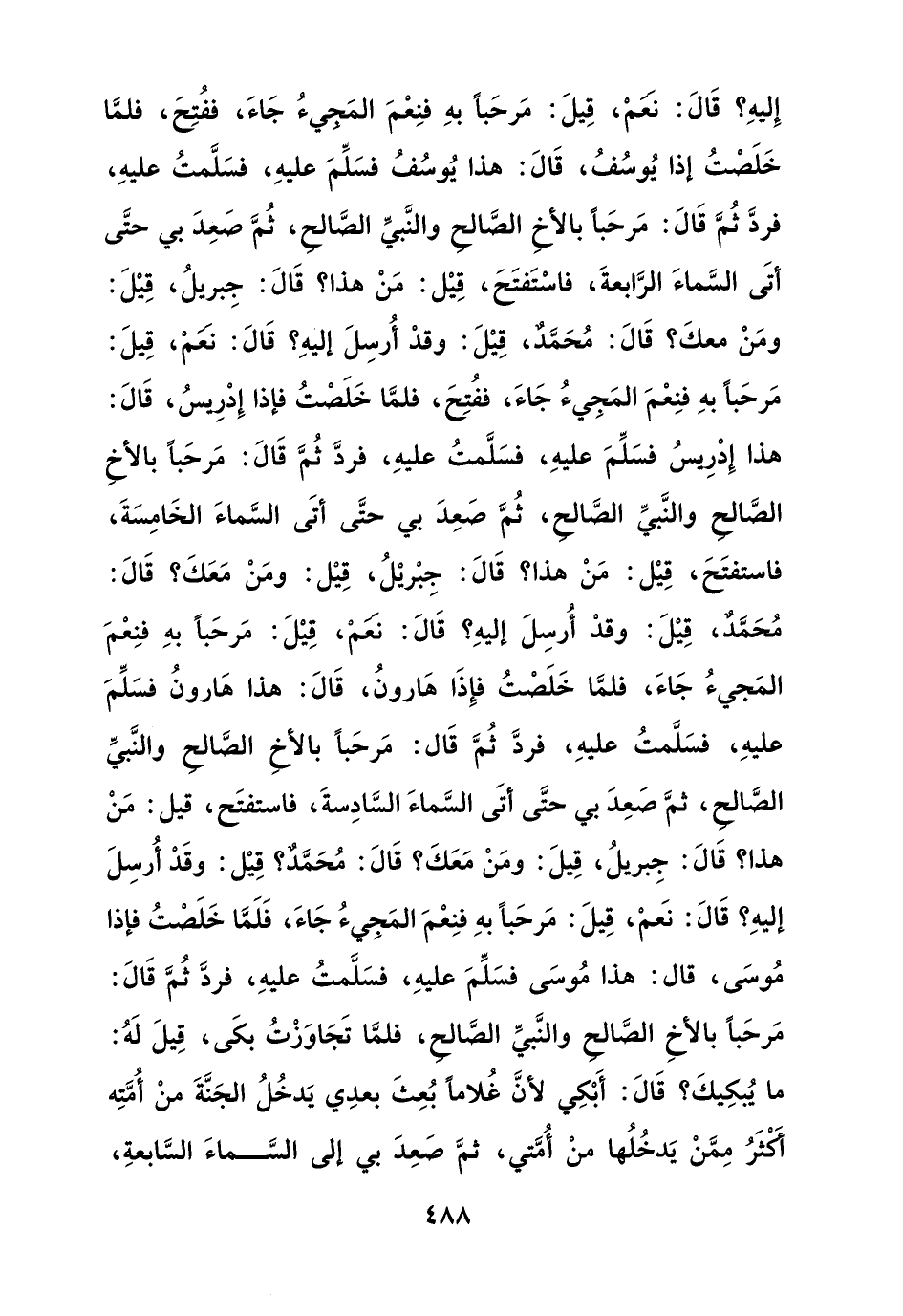 إليه, قال: نعم, قيل: مرحبا به فنعم المجيء جاء, ففتح, فلما خلصت إذا يوسف, قال: هذا يوسف فسلم عليه, فسلمت عليه, فرد ثم قال: مرحبا بالأخ الصالح والنبي الصالح, ثم صعد بي حتى أى السماء الرابعة, فاستفتح, قيل: من هذا؟ قال: جبريل, قيل: ومن معك؟ قال: محمد, قيل: وقد أرسل إليه؟ قال: نعم, قيل: مرحبا به فنعم المجيء جاء, ففتح, فلما خلصت فإذا إدريس, قال: هذا إدريس فسلم عليه, فسلمت عليه, فرد ثم قال: مرحبا بالأخ الصالح والنبي الصالح, ثم صعد بي حتى أتى السماء الخامسة, فاستفتح, قيل: من هذا؟ قال: جبريل, قيل: ومن معك؟ قال: محمد, قيل: وقد أرسل إليه؟ قال: نعم, قيل: مرحبا به فنعم المجيء جاء, فلما خلصت فإذا هارون, قال: هذا هارون فسلم عليه, فسلمت عليه, فرد ثم قال: مرحبا بالأخ الصالح والنبي الصالح, ثم صعد بي حتى أتى السماء السادسة, فاستفتح, قيل: من هذا؟ قال: جبريل, قيل: ومن معك؟ قال: محمد؟ قيل: وقد أرسل إليه؟ قال: نعم, قيل: مرحبا به فنعم المجيء جاء, فلما خلصت فإذا موسى, قال: هذا موسى فسلم عليه, فسلمت عليه, فرد ثم قال: مرحبا بالأخ الصالح والنبي الصالح, فلما جاوزت بكى, قيل له: ما يبكيك؟ قال: أبكي لأن غلاما بعث بعدي يدخل الجنة من أمته أكثر ممن يدخلها من أمتي, ثم صعد بي إلى السماء السابعة,