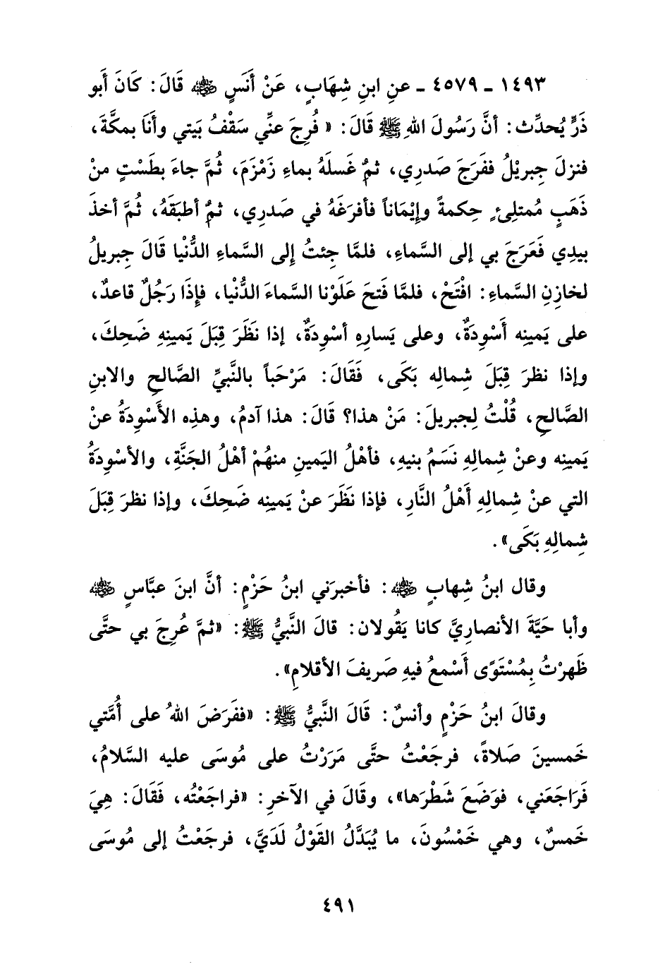 1493 - 4579 - عن ابن شهاب, عن أنس رضي الله عنه قال: كلن أبو ذر يحدث: أن رسول الله صلى الله عليه وسلم قال: "فرج عني سقف بيتي وأنا بمكة, فنزل جبريل ففرج صدري, ثم غسله بماء زمزم, ثم جاء بطست من ذهب ممتلئ حكمة وإيمانا فأفرغه في صدري, ثم أطبقه, ثم أخذ بيدي فعرج بي إلى السماء, فلما جئت إلى السماء الدنيا, فإذا رجل قاعد, على يمينه أسودة, وعلى يساره أسودة, إذا نظر قبل يمينه ضحك, وإذا نظر قبل شماله بكى, فقال: مرحبا بالنبي الصالح والابن الصالح, قلت لجبريل: من هذا؟ قال: هذا آدم, وهذه الأسودة عن يمينه وعن شماله نسم بنيه, فأهل اليمين منهم أهل الجنة, والأسودة التي عن شماله أهل النار, فإذا نظر عن يمينه ضحك, وإذا نظر قبل شماله بكى"