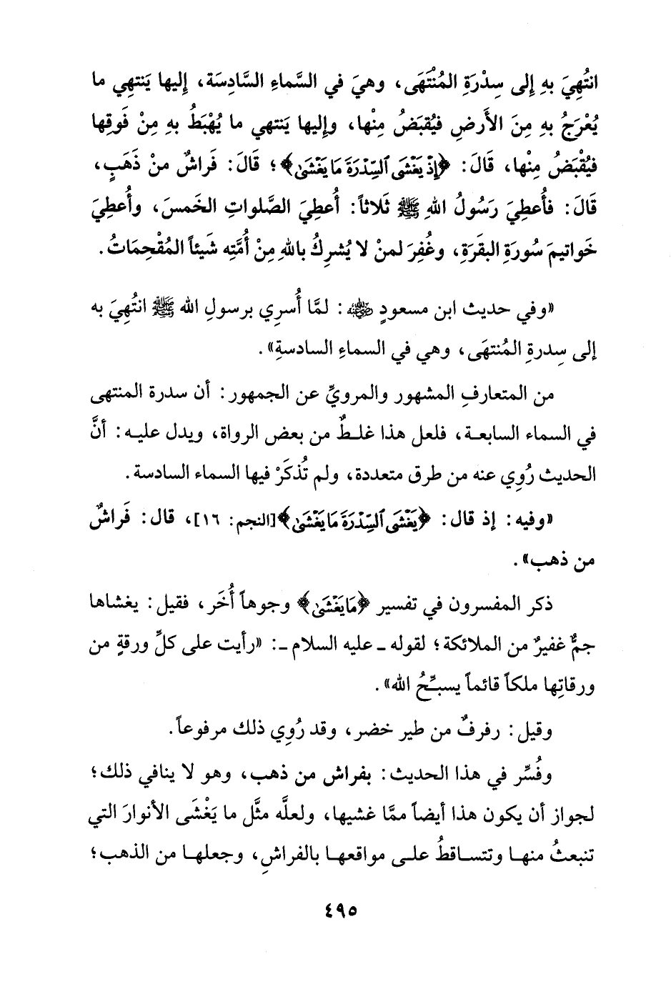 انتهي به إلى سدرة المنتهى, وهي في السماء السادسة, إليها ينتهي ما يعرج به من الأرض فيقبض منها, وإليها ينتهي ما يهبط به من فوقها فيقبض منها, قال: {إذ يغشى السدرة ما يغشى} , قال: فراش من ذهب, قال: فأعطي رسول الله صلى الله عليه وسلم ثلاثا: أعطي الصلوات الخمس, وأعطي خواتيم سورة البقرة, وغفر لمن لا يشرك بالله من أمته شيئا المقحمات.
