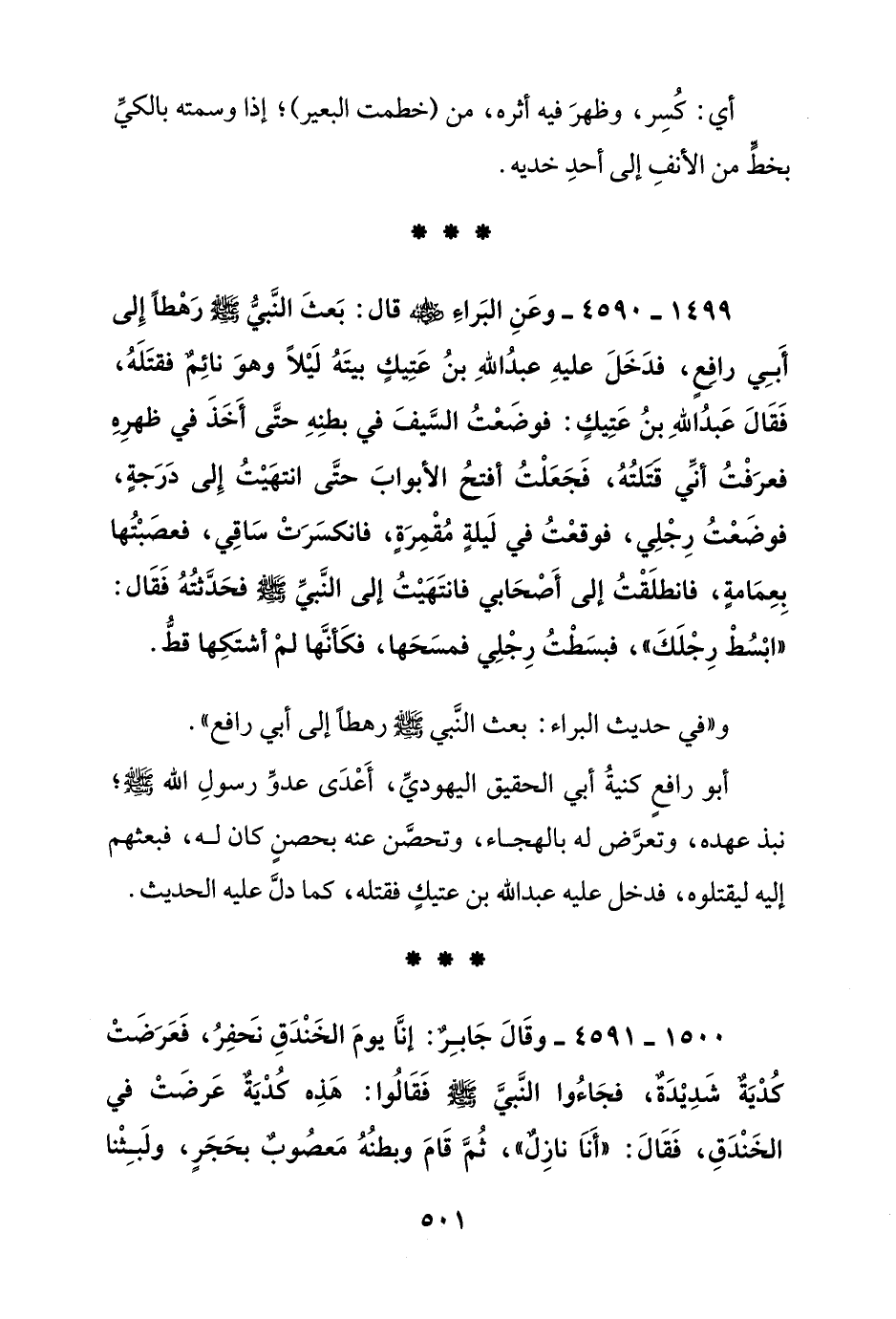 1499 – 4590 – وعن البراء رضي الله عنه قال: بعث النبي صلى الله عليه وسلم رهطا إلى أبي رافع فدخل عليه عبد الله بن عتيك بيته ليلا وهو نائم فقتله, فقال عبد الله بن عتيك: فوضعت السيف في بطنه حتى أخذ في ظهره فعرفت أني قتلته, فجعلت أفتح الأبواب حتى انتهيت إلى درجة, فوضعت رجلي, فوقعت في ليلة مقمرة, فانكسرت ساقي, فعصبتها بعمامة, فانطلقت إلى أصحابي فانتهيت إلى النبي صلى الله عليه وسلم فحدثته فقال: "ابسط رجلك", فبسطت رجلي فمسحها, فكأنها لم أشتكها قط"
