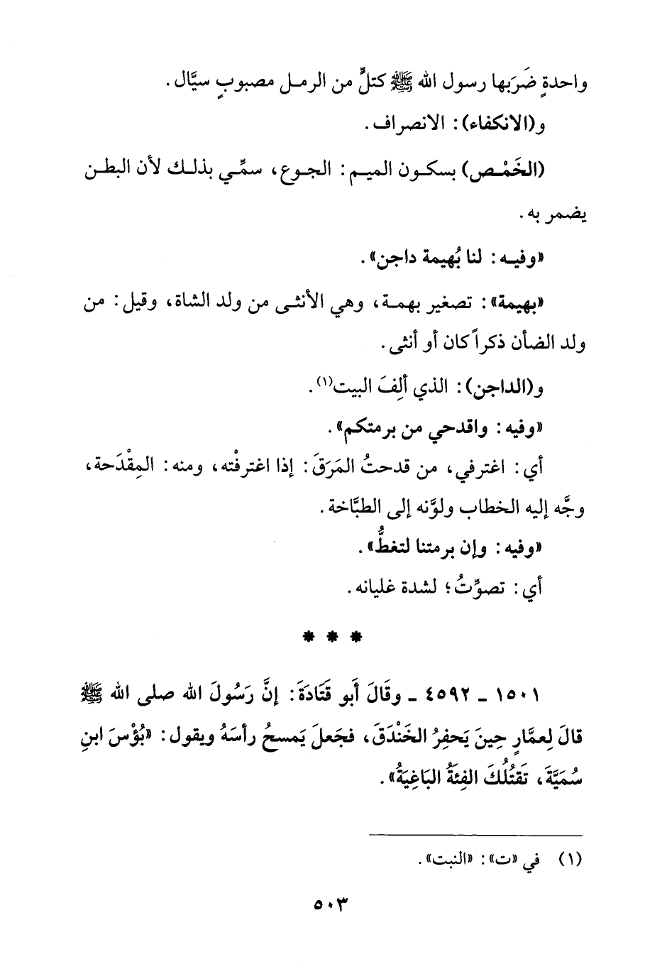 1501 – 4592 - وقال أبو قتادة: إن رسول الله صلى الله عليه وسلم قال عمار حين يحفر الخندق, فجعل يمسح رأسه ويقول: "بؤس ابن سمية, تقتلك الفئة الباغية"