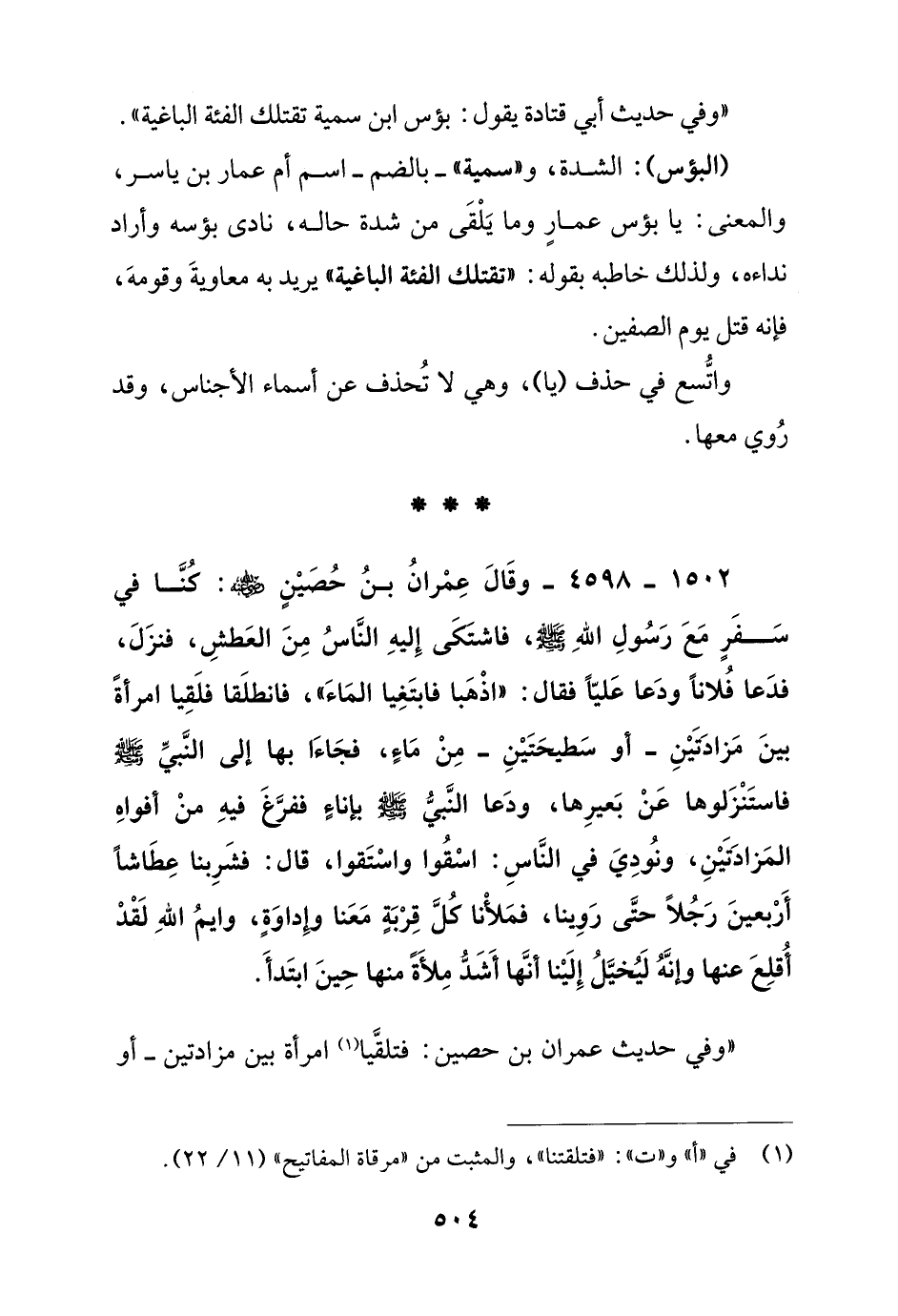 1502 – 4598 – وقال عمران بن حصين رضي الله عنه: كنا في سفر مع رسول الله صلى الله عليه وسلم, فاشتكى إليه الناس من العطش, فنزل, فدعا فلانا ودعا عليا فقال: "اذهبا فابتغيا الماء" فانطلقا فلقيا امرأة بين مزادتين –أو سطيحتين- من ماء, فجاءا بها إلى النبي صلى الله عليه وسلم فاستنزلوها عن بعيرها, ودعا النبي صلى الله عليه وسلم بإناء ففرغ فيه من أفواه المزادتين, ونودي في الناس: اسقوا واستقوا, قال: فشربنا عطاشا أربعين رجلا حتى روينا, فملأنا كل قرية معنا وإداوة, وايم الله لقد أقلع عنها وإنه ليخيل إلينا أنها أشد ملأة منها حين ابتدأ.