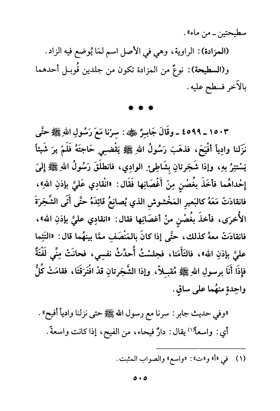 1503 - 4599 - وقال جابر رضي الله عنه: سرنا مع رسول الله صلى الله عليه وسلم حتى نزلنا واديا أفيح, فذهب رسول الله صلى الله عليه وسلم يقضي حاجته فلم ير شيئا يستتر به, وإذا شجرتان بشاطئ الوادي, فانطلق رسول الله صلى الله عليه وسلم إلى إحداهما فأخذ بغصن من أغصانها فقال: "انقادي علي بإذن الله", فانقادت معه كالبعير المخشوش الذي يصانع قائده حتى أتى الشجرة الأخرى, فأخذ بغصن من أغصانها فقال: "انقادي علي بإذن الله", فانقادت معه كذلك, حتى إذا كان بالمنصف مما بينهما قال: "التئما علي بإذن الله" فالتأمتا, فجلست أحدث نفسي, فحانت مني لفتة فإذا أنا برسول الله صلى الله عليه وسلم مقبلا, وإذا الشجرتان قد افترقتا, فقامت كل واحدة منهما على ساق"