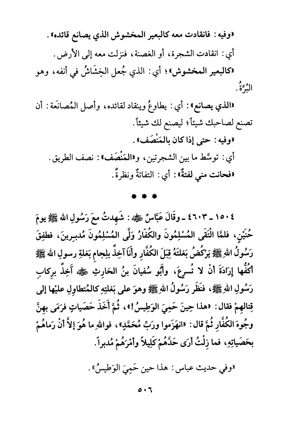 1504 - 4603 - وقال ابن عباس رضي الله عنه: شهدت مع رسول الله صلى الله عليه وسلم يوم حنين, فلما التقى المسلمون والكفار ولي المسلمون مدبرين, فطفق رسول الله صلى الله عليه وسلم يركض بغلته قبل الكفار وأنا آخذ بلجام بغلة رسول الله صلى الله عليه وسلم أكفها إرادة أن لا تسرع, وأبوسفيان بن الحارث رضي الله عنه أخذ بركاب رسول الله صلى الله عليه وسلم, فنظر رسول الله صلى الله عليه وسلم وهو على بغلته كالمتطاول عليها إلى قتالهم فقال: "هذا حين حمي الوطيس! " ثم أخذ حصيات فرمى بهن وجوه الكفار ثم قال: "انهزموا ورب محمد" فوالله ما هو إلا أن رماهم بحصياته, فما زلت أرى حدهم كليلا وأمرهم مدبرا"