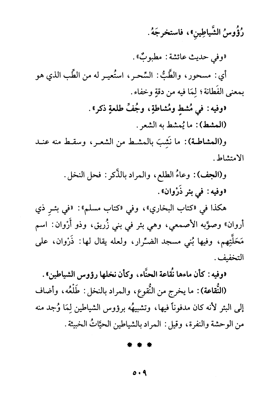 (النقاعة): ما يخرج من النقوع, والمراد بالنخل: طلعه, وأضاف إلى البئر لأنه كان مدفونا فيها, وتشبيهه برؤوس الشياطين لما وجد منه من الوحشة والنفرة, وقيل: المراد بالشياطين الحيات الخبيثة.