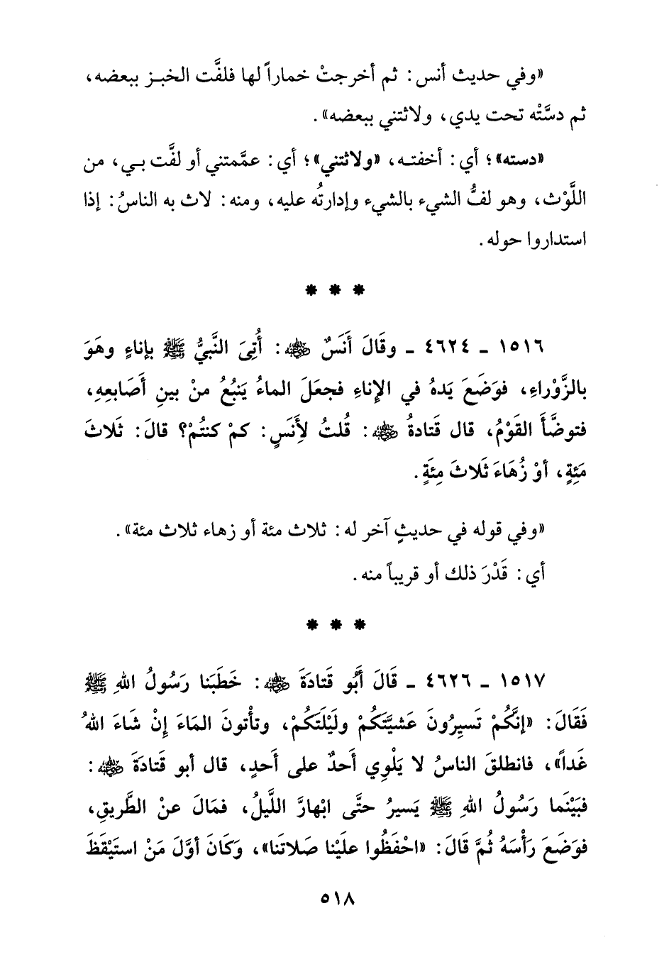 1516 – 4624 – وقال أنس رضي الله عنه: أتى النبي صلى الله عليه وسلم بإناء وهو بالزوراء, فوضع يده في الإناء فجعل الماء ينبع من بين أصابعه, فتوضأ القوم, قال قتادة رضي الله عنه: قلت لأنس: كم كنتم؟ قال: ثلاث مئة, أو زهاء ثلاث مئة.