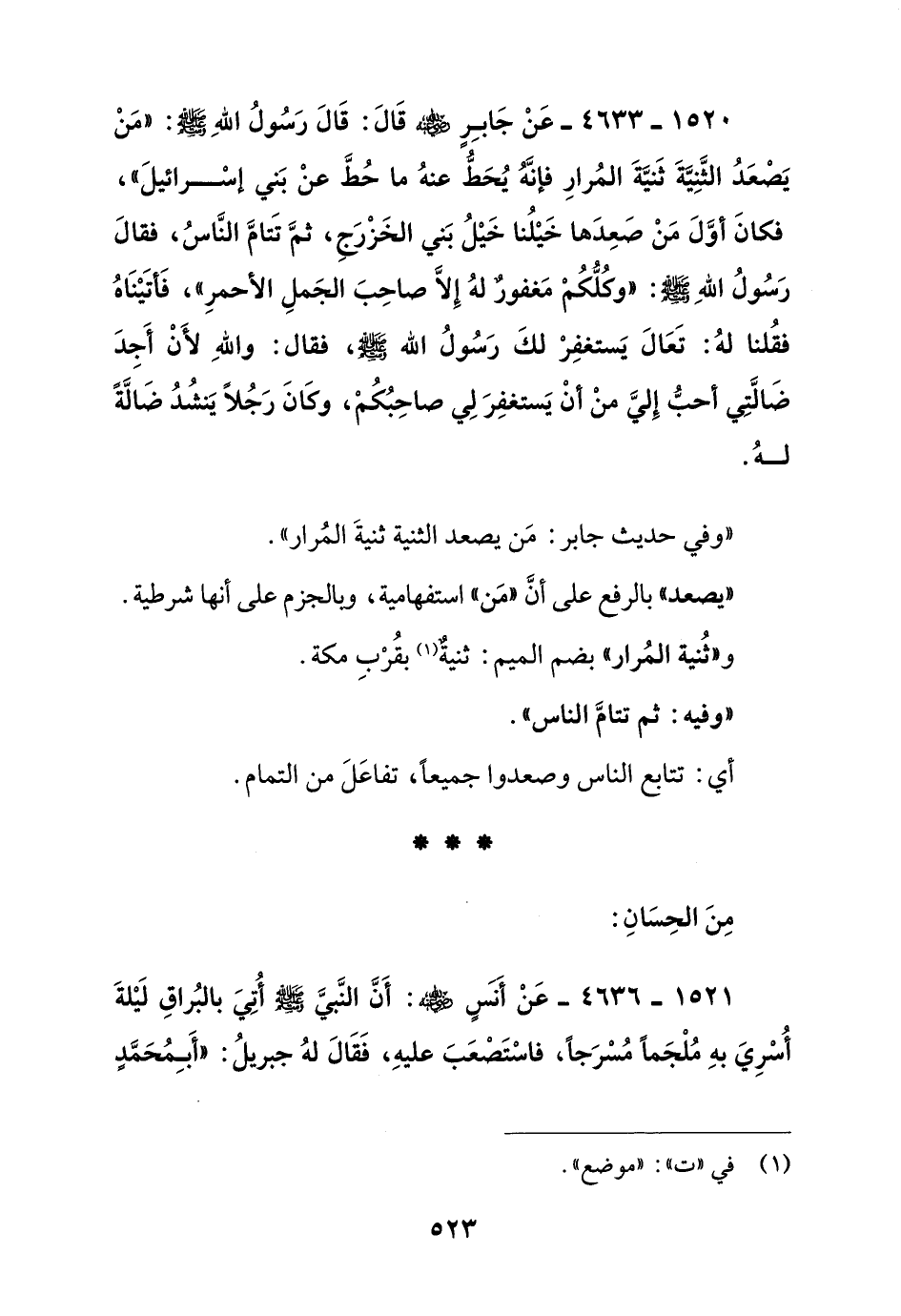1520 – 4633 - عن جابر رضي الله عنه قال: قال رسول الله صلى الله عليه وسلم: "من يصعد الثنية ثنية المرار فإنه يحط عنه ما حط عن بني إسرائيل", فكان أول من صعدها خيلنا خيل بني الخزرج, ثم تتام الناس, فقال رسول الله صلى الله عليه وسلم: "وكلكم مغفور له إلا صاحب الجمل الأحمر", فأتيناه فقال له: تعال يستغفر لك رسول الله صلى الله عليه وسلم, فقال: والله لأن أجد ضالتي أحب إلي من أن يستغفر لي صاحبكم, وكان رجلا ينشد ضالة له"