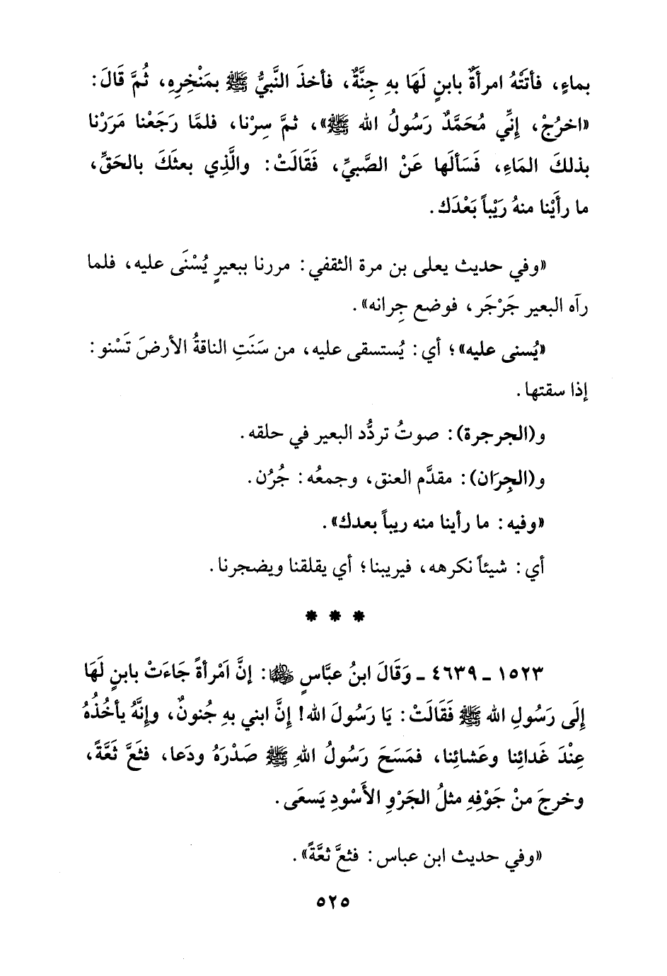 1523 – 4639 – وقال ابن عباس رضي الله عنهما: إن امرأة جاءت بابن لها إلى رسول الله صلى الله عليه وسلم فقالت: يا رسول الله! إن ابني به جنون, وإنه يأخذه عند غدائنا وعشائنا, فمسح رسول الله صلى الله عليه وسلم صدره ودعا, فثع ثعة, وخرج من جوفه مثل الجرو الأسود يسعى"